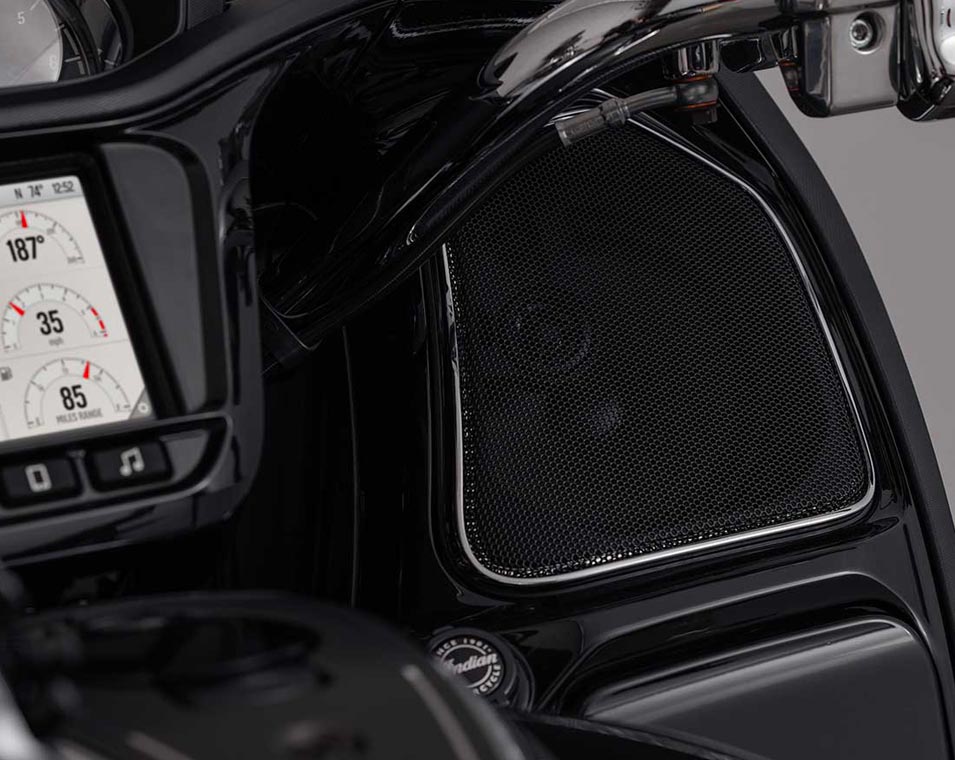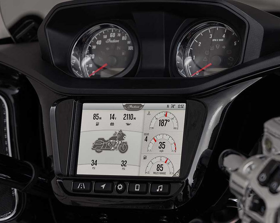 7" touchscreen powered by RIDE COMMAND: 7" touchscreen display with real-time clock; ambient air temperature; heading; audio information display; map/navigation; Bluetooth status for phone and headset; vehicle status (tire pressure, voltage, engine hours, oil change); vehicle info (speed, fuel range, RPM, gear position); current ride data (distance, moving time, stop time, altitude, altitude change); trip meters; ride mode selection; screen brightness; vehicle trouble code readout; Apple CarPlay integration.