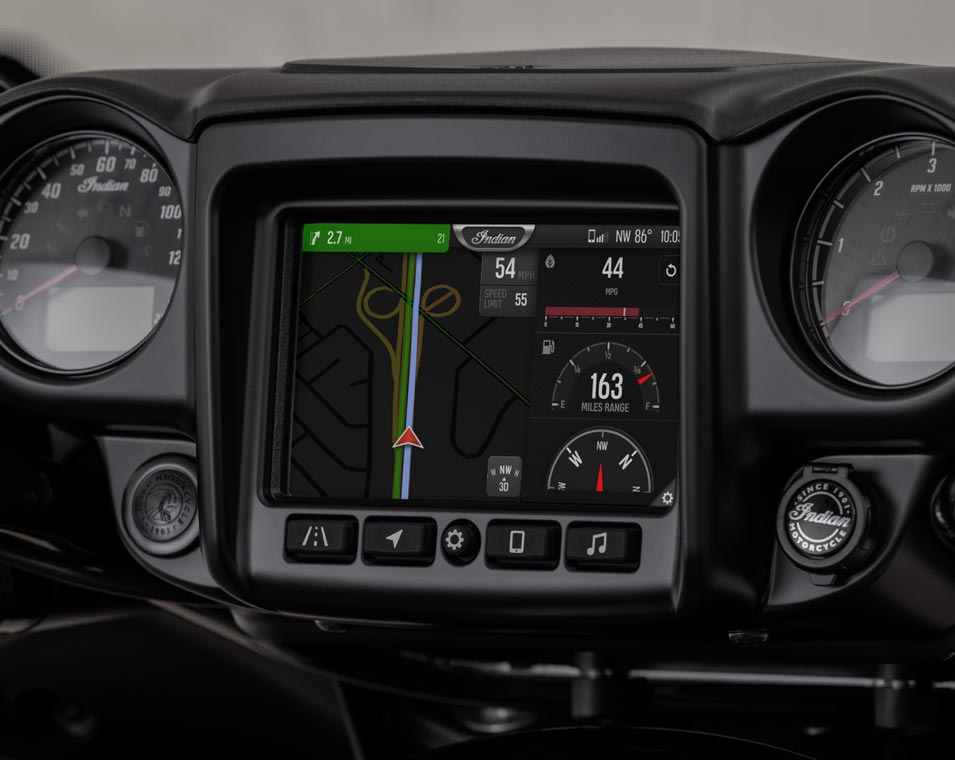 7" touchscreen powered by RIDE COMMAND: 7" touchscreen display with real-time clock; ambient air temperature; heading; audio information display; Bluetooth status for phone and headset; vehicle status (tyre pressure, voltage, engine hours, oil change); vehicle info (speed, fuel range, RPM, gear position); current ride data (distance, moving time, stop time, altitude, altitude change); trip meters; ride mode selection; screen brightness; vehicle trouble code readout; Apple CarPlay integration.